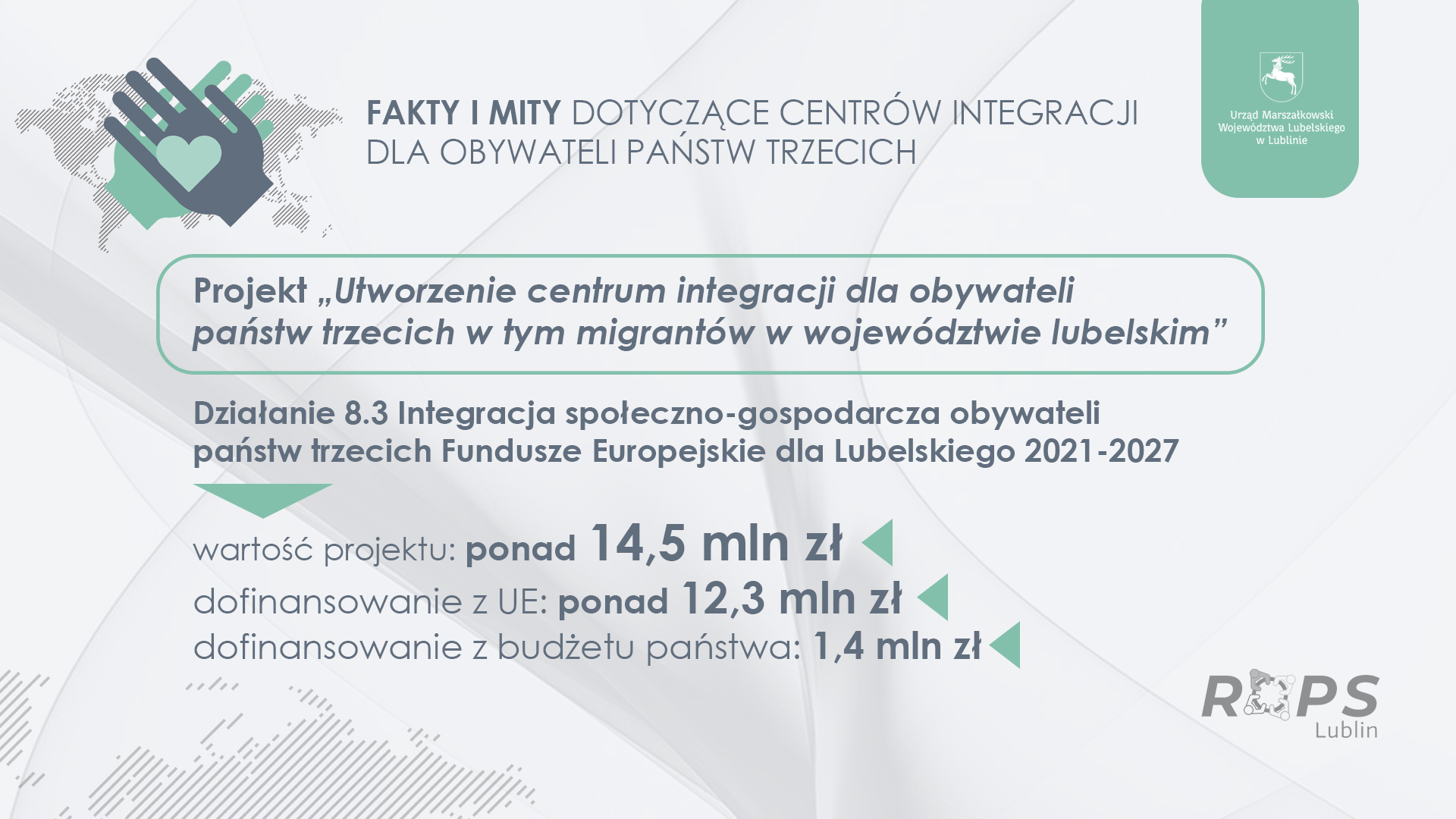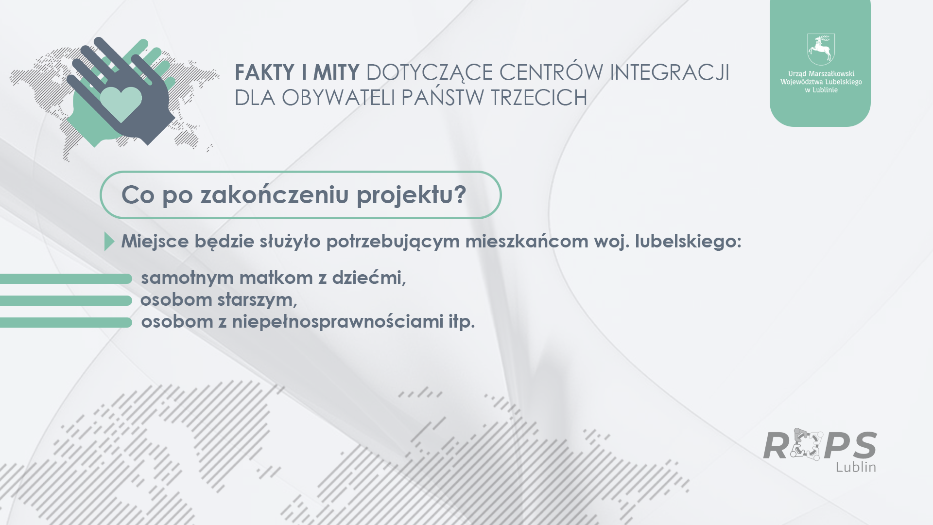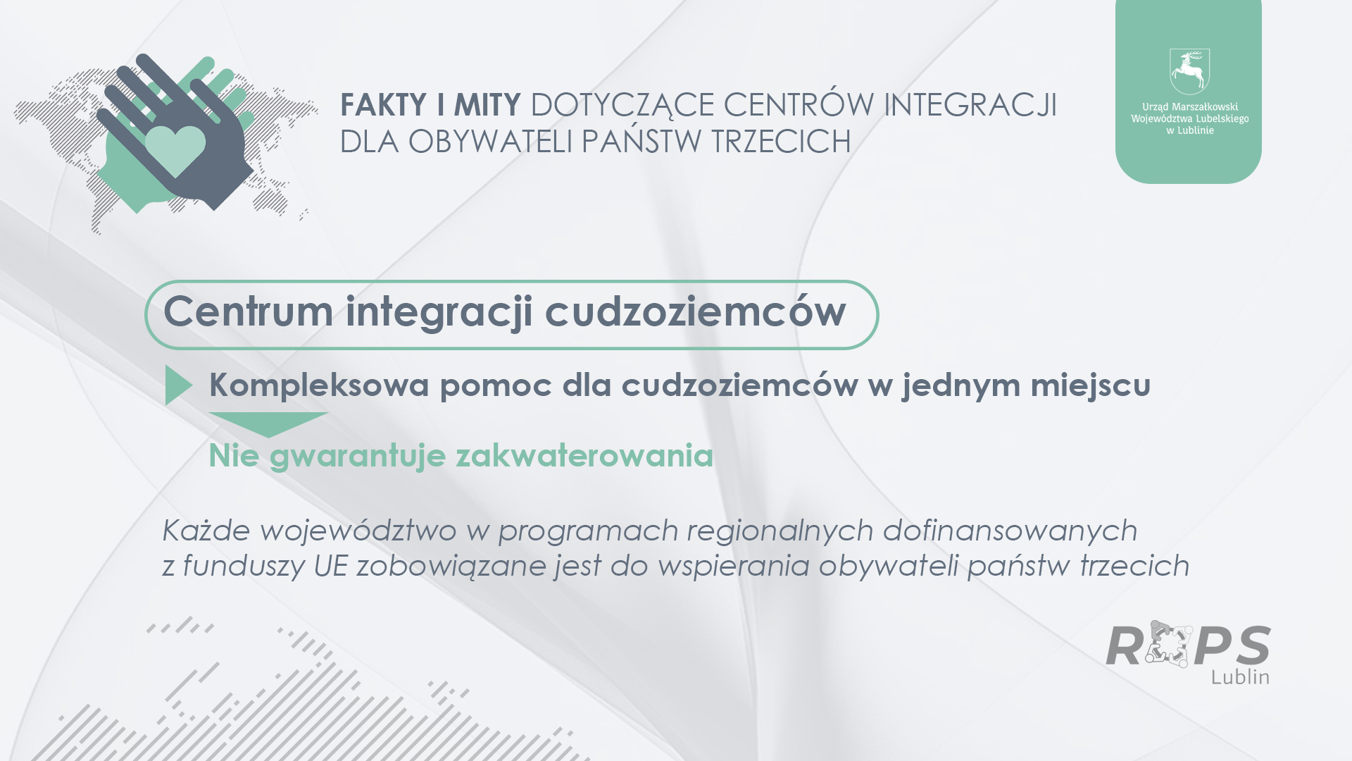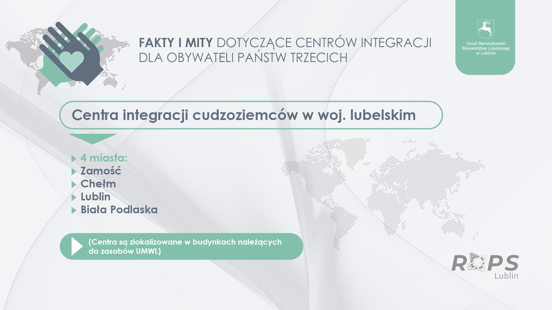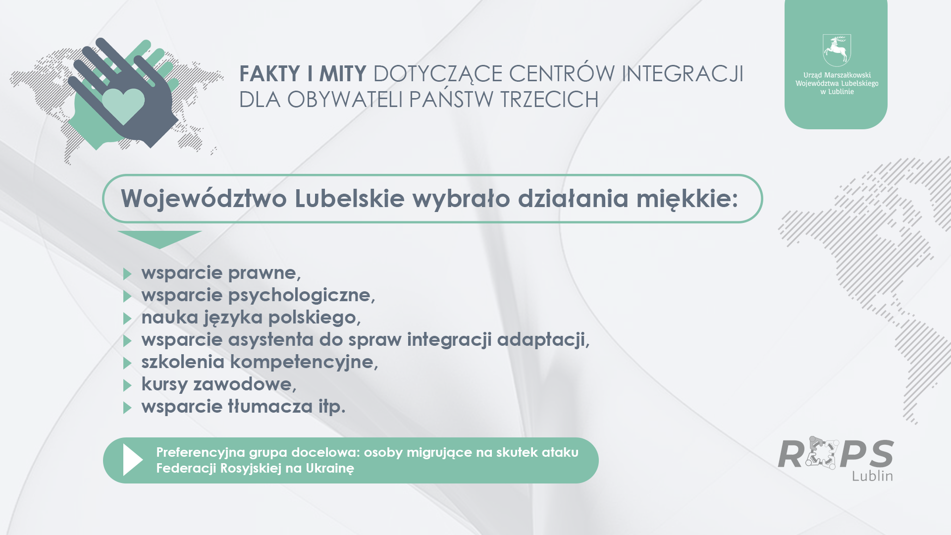Działania te można było realizować na dwa sposoby przez działania miękkie (Europejski Fundusz Społeczny+) lub poprzez realizację inwestycji w tym zakresie, czyli budowę centrów integracji dla OPT (Europejski Fundusz Rozwoju Regionalnego). Województwo Lubelskie wybrało opcję inwestycji w działania miękkie oraz preferencyjną grupę docelową, czyli uwzględnienie migracji osób na skutek ataku Federacji Rosyjskiej na Ukrainę. W związku z tym, że na działania związane z obywatelami państw trzecich nie przewidziano w programach regionalnych budowy infrastruktury, miejsca działań w Zamościu, Chełmie, Lublinie i Białej Podlaskiej zlokalizowane są w budynkach należących do zasobów UMWL. W tych lokalizacjach nie planowano i nie zamierza się planować miejsc pobytowych dla osób legalnie przebywających w Polsce. Prowadzone są tam następujące działania:
