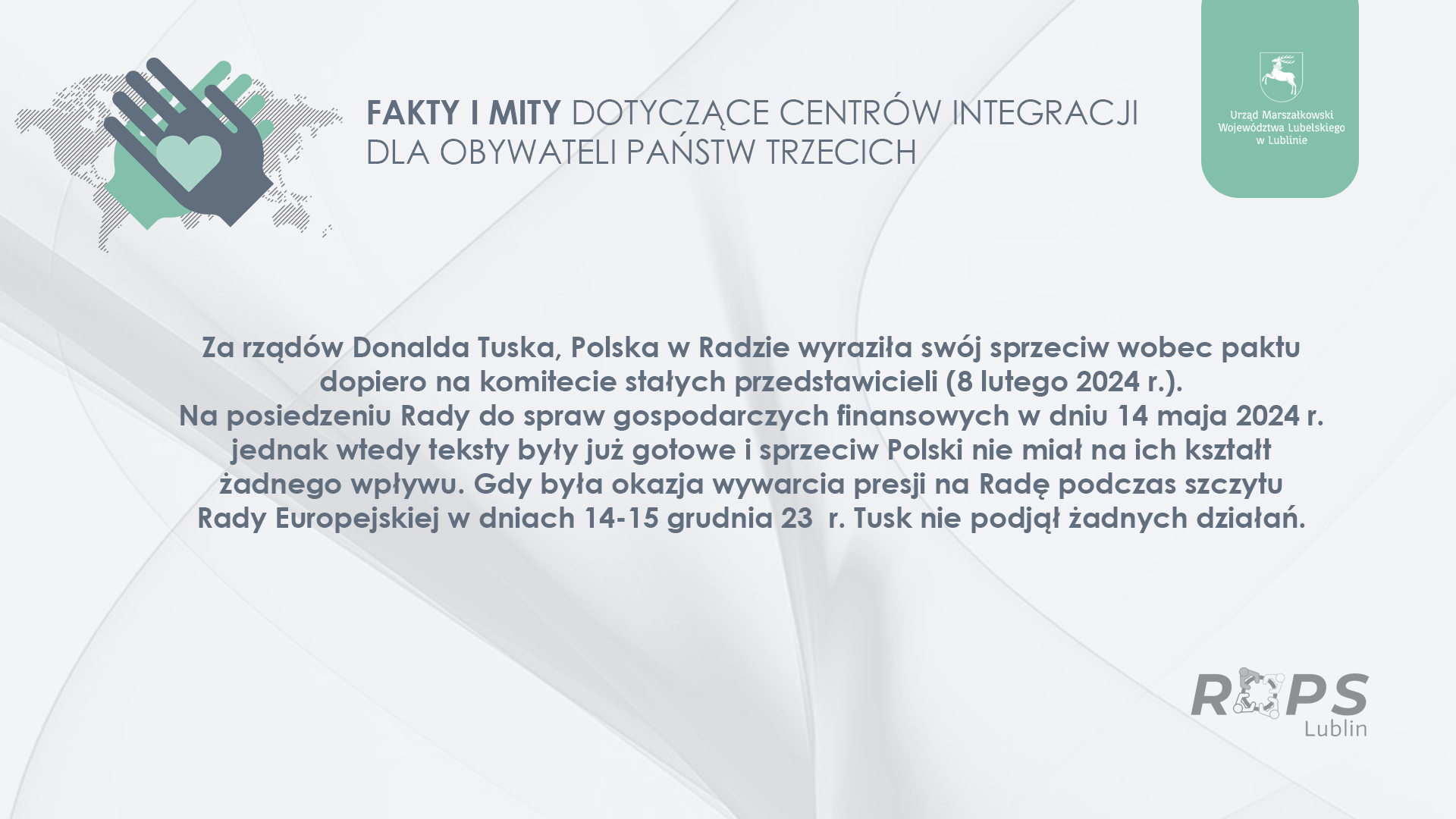 Za rządów Donalda Tuska, Polska w Radzie wyraziła swój sprzeciw wobec paktu dopiero na komitecie stałych przedstawicieli (8 lutego 2024 r.), na posiedzeniu Rady ds. gospodarczych finansowych (14 maja 2024 r.). Jednak wtedy teksty były już gotowe i sprzeciw Polski nie miał na ich kształt żadnego wpływu. Gdy była okazja wywarcia presji na Radę podczas szczytu Rady Europejskiej w dniach 14-15 grudnia 2023 r., Tusk nie podjął żadnych działań.