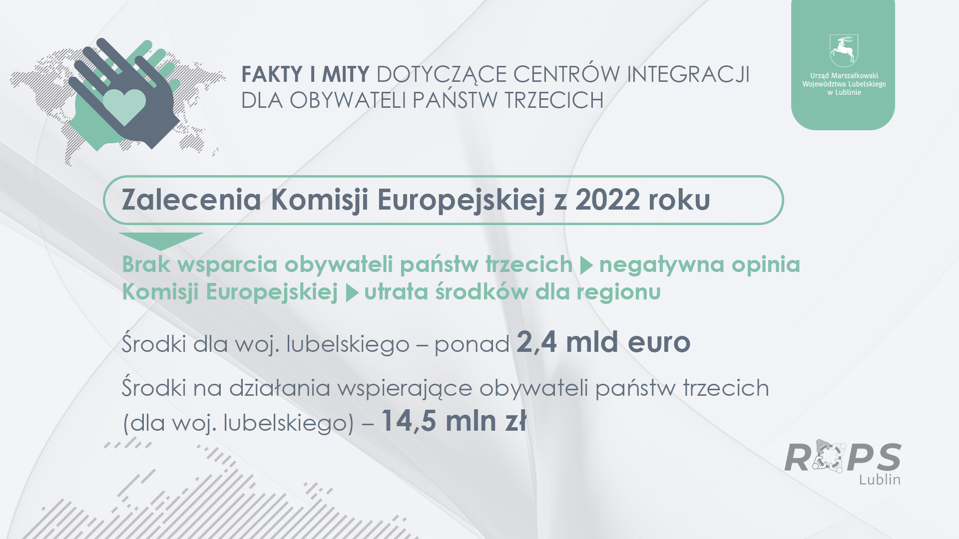 Utworzenie Centrum Integracji dla obywateli państw trzecich wynika z uwag, jakie przedstawiono zostały podczas negocjacji założeń programu FEL w zakresie zaleceń Komisji Europejskiej z 2022 roku dotyczących wsparcia obywateli państw trzecich. Brak uwzględnienia wsparcia skutkowałby wydaniem negatywnej opinii przez Komisję Europejską, a tym samym utratą środków dla regionu w wysokości ponad 2,4 miliarda euro. Działania wspierające obywateli państw trzecich to zaledwie 14,5 miliona złotych (ponad 3,3 miliona euro).