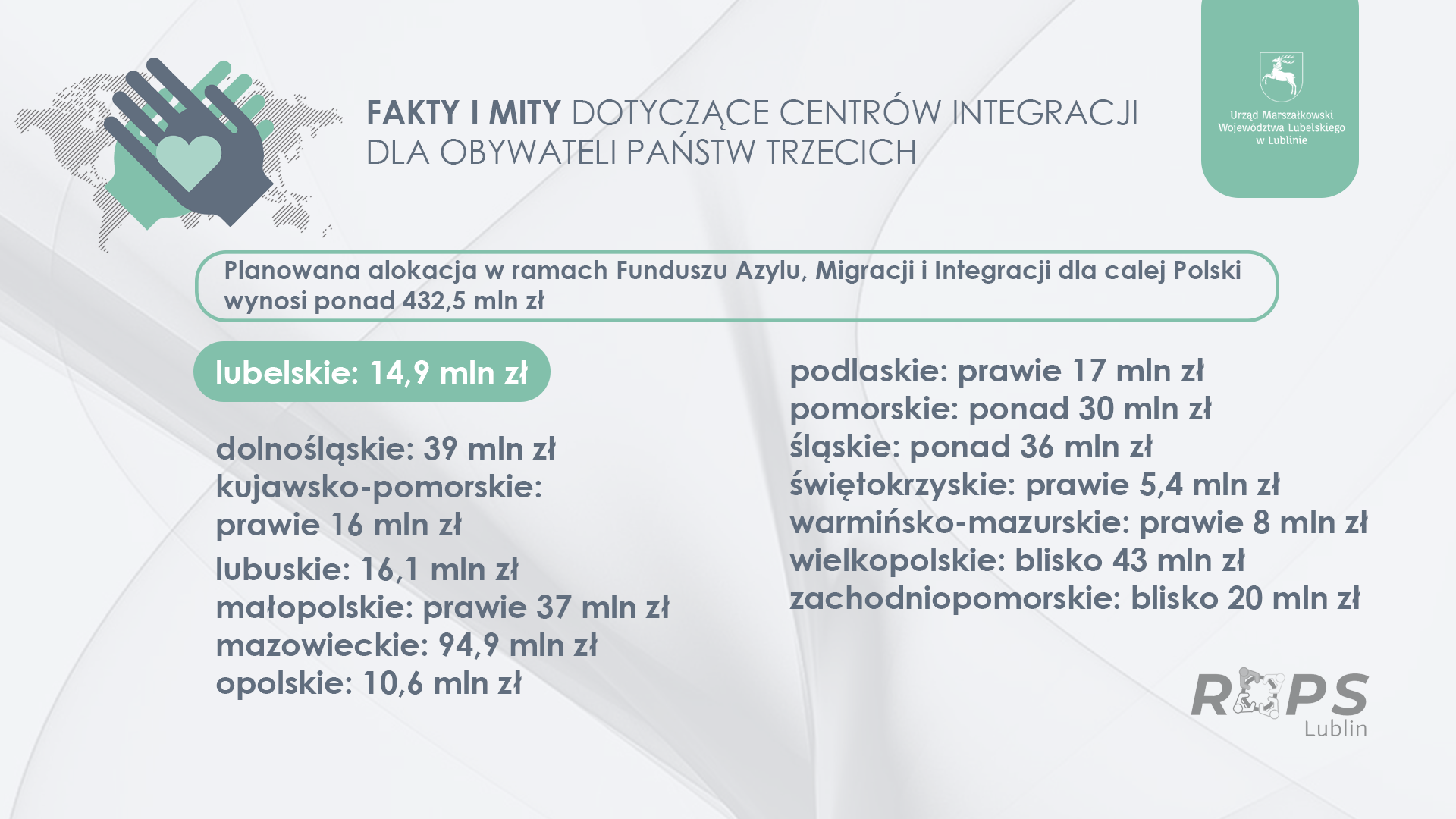 Planowana alokacja w ramach Funduszu Azylu, Migracji i Integracji dla całej Polski wynosi ponad 432,5 mln zł. Dla poszczególnych województw: