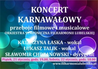 Karnawałowej zabawy ciąg dalszy, a skoro dobra zabawa to oczywiście muzyka filmowa i musicalowa. Koncert w najbliższy piątek i sobotę 21 i 22.01 to idealna propozycja na zimowy wieczór, który dzięki wybitnym solistom i Orkiestrze Symfonicznej Filharmonii Lubelskiej wypełni się muzyką ze wspaniałych broadwayowskich musicali oraz hollywoodzkich filmów.