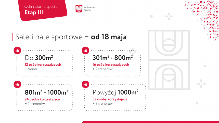 Od 18 maja będą udostępnione sale i hale sportowe. Limity osób, które będą mogły jednocześnie korzystać z danego obiektu, zostały dostosowane do ich powierzchni.