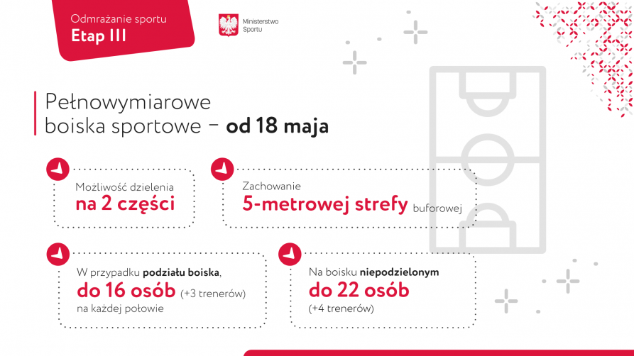 W przypadku pełnowymiarowych boisk piłkarskich limit osób to 22 osoby oraz 4 trenerów. Jednocześnie będzie możliwość podzielenia boiska pełnowymiarowego na dwie części. Wówczas na każdej połowie będzie mogło w tym samym momencie przebywać 16 osób + 3 trenerów. Przy podziale pełnowymiarowego boiska należy zachować 5-cio metrową strefę buforową.