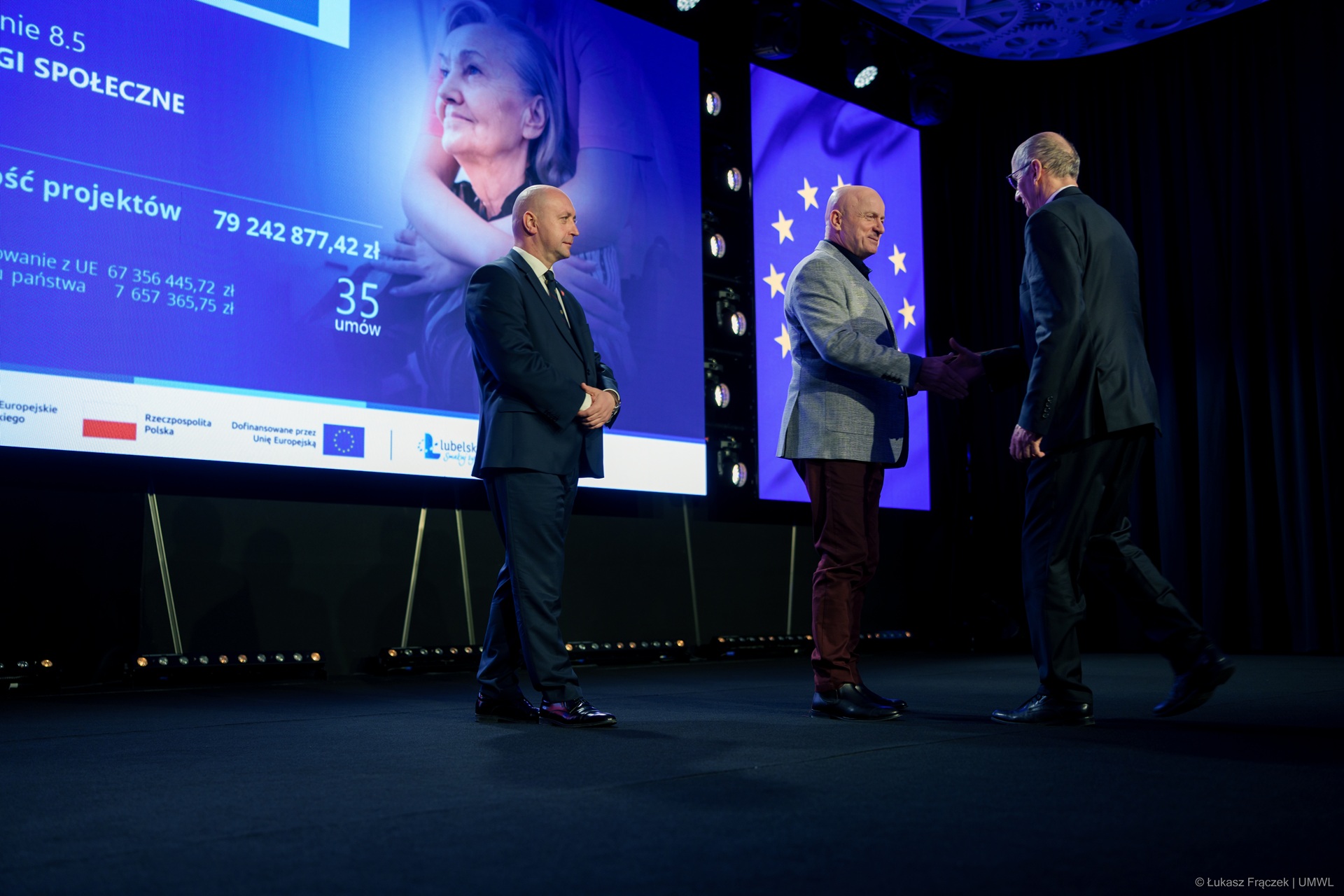 Uroczystość rozpoczęto wręczeniem 35 umów o dofinansowanie projektów z Działania 8.5 Usługi społeczne o łącznej wartości około 80 mln zł, z czego dofinansowanie z UE to ponad 67 mln zł, a wkład Budżetu Państwa to prawie 8 mln zł.
