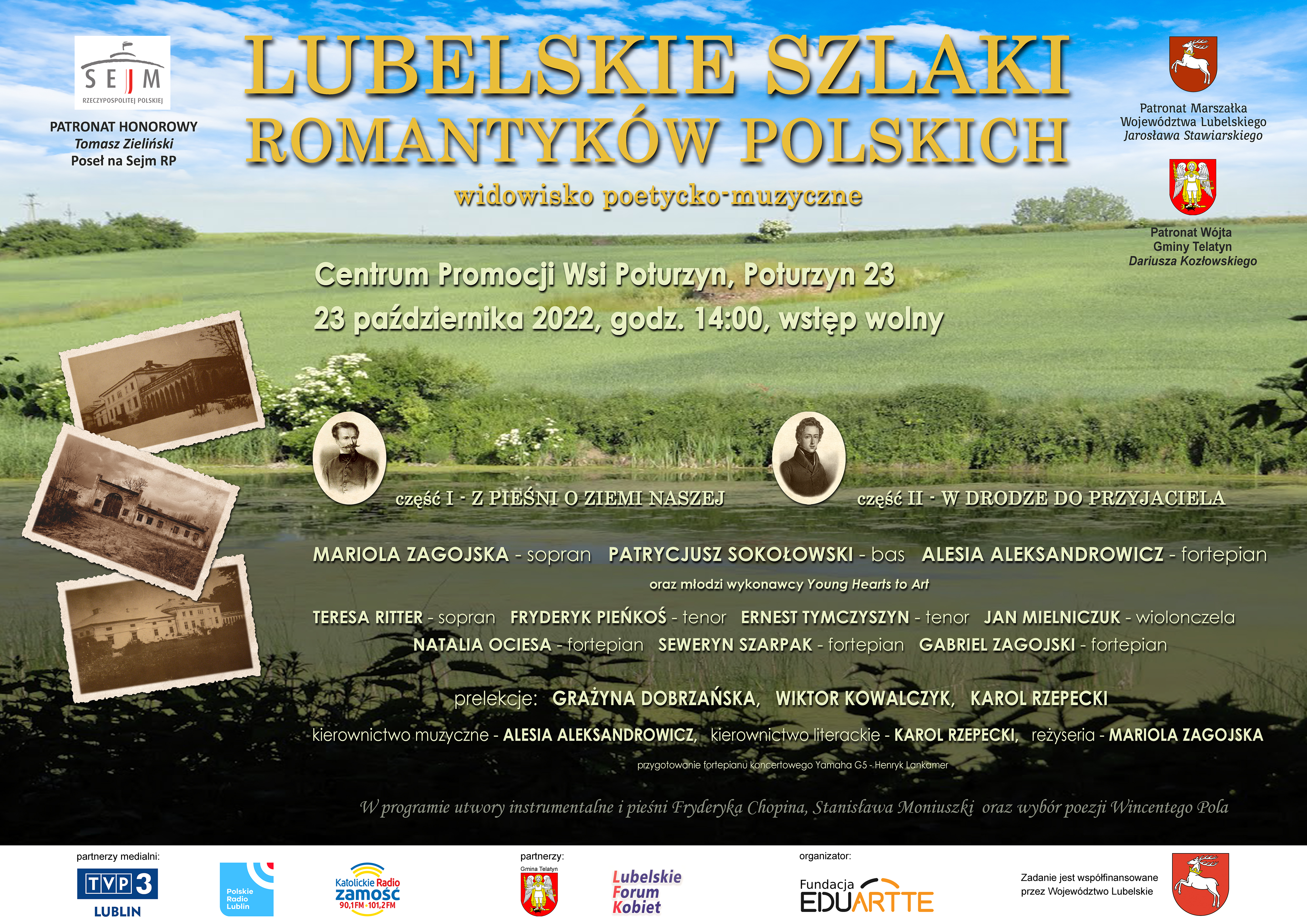 W Roku Romantyzmu Polskiego Fundacja Eduartte zaprasza na widowisko poetycko-muzyczne Lubelskie szlaki romantyków polskich, do pięknego Poturzyna, miejsca, które szczególnie zainspirowało Fryderyka Chopina, podczas jego pobytu na Lubelszczyźnie, u przyjaciela Tytusa Woyciechowskiego.