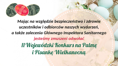 – przesunięcie na inne terminy lub odwołanie następujących wydarzeń: Międzywojewódzki Konkurs Recytatorski Poezji i Prozy Ludowej im. Wacława Tuwalskiego, XVI Wojewódzki Konkurs Literacki, II Wojewódzki Konkurs na Palmę i Pisankę Wielkanocną, Konferencja WOK/WRTR „Towarzystwo Regionalne w życiu lokalnej społeczności”,