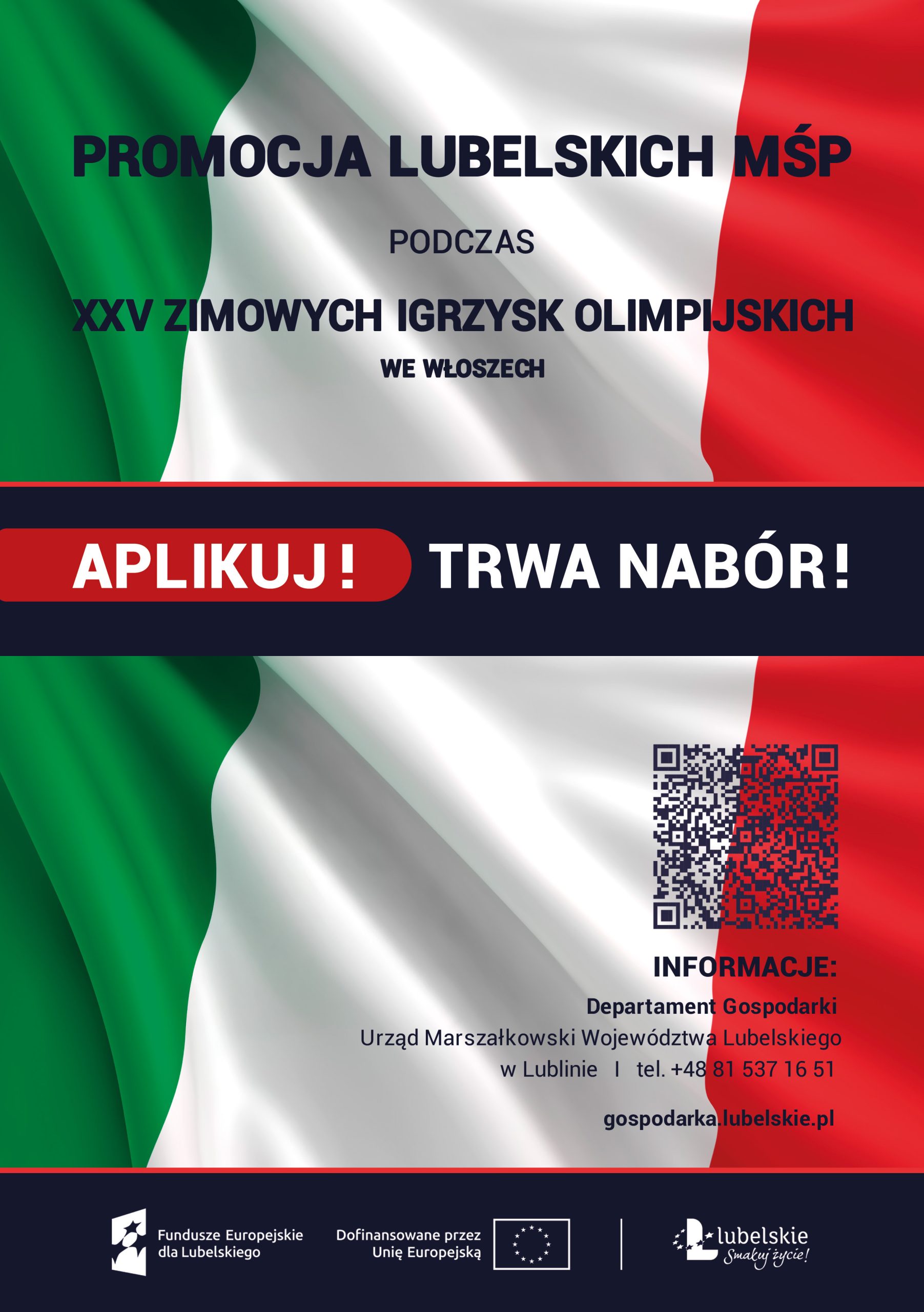 Urząd Marszałkowski Województwa Lubelskiego w Lublinie zaprasza przedsiębiorców z województwa lubelskiego do udziału w naborze na wyjazd związany z promocją przedsiębiorców (MŚP) podczas XXV Zimowych Igrzysk Olimpijskich we Włoszech, w terminach: Mediolan 10-12 lutego 2026 r., Predazzo 14-16 lutego 2026 r. oraz Predazzo 16-18 lutego 2026 r.