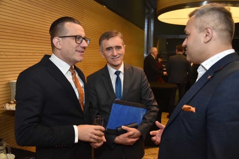 Bogdan Kawałko obok dwóch mężczyzn w garniturach w czasie rozmowy